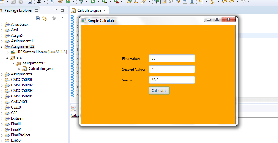 This assignment involves building a simple calculator using Java FX. The calculator shall allow the user to enter two values and then calculate their sum when the user clicks on the Calculate button. The GUI should look similar to the one below. You can left justify, center, or right justify the calculate button.