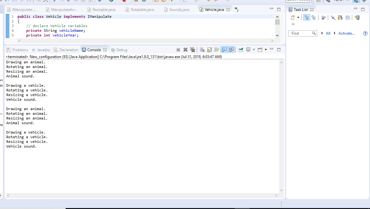 - Develop a program called ManipulateAnimals that does the following: An Animal class will be used to model some basic characteristics of animals for the application. An animal will have a name attribute and methods to set the name and get the name. Animals can make sounds and are drawable, rotatable, and resizable. A Vehicle class will be used to model some basic characteristics of vehicles. A vehicle will have a name and an age, and methods to get/set these attributes. Vehicles can also make sounds and are drawable, rotatable, and resizable. Create a collection of 2 vehicles and 2 animals stored in the same array. Loop through the array and execute the drawObject(), rotateObject(), resizeObject(), and playSound() methods polymorphically for each element in the array. The drawObject() method should simply display the message “Drawing a Vehicle” or “Drawing an Animal”; the rotateObject() method should display the message “Rotating a Vehicle” or “Rotating an Animal”; and the playSound() method should display the message “Animal sound” or “Vehicle sound”, depending upon the type of element that is in the array. The resizeObject() method should display “Resizing a Vehicle” or “Resizing an Animal”.