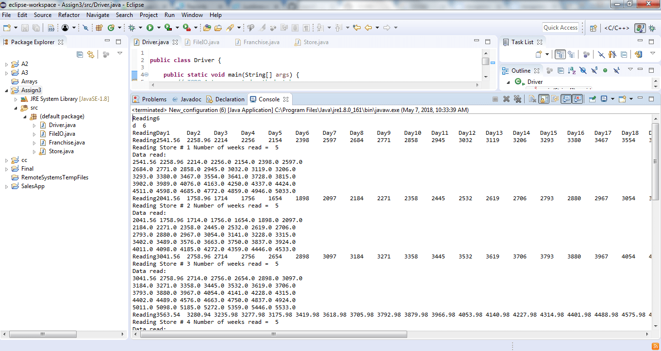 The file contains the dollars amount of sales that a retail store made each day for a number of weeks. Each line in the file contains thirty five numbers, which are sales numbers for five weeks. The number are separated by space. Each line in the file represents a separate store.