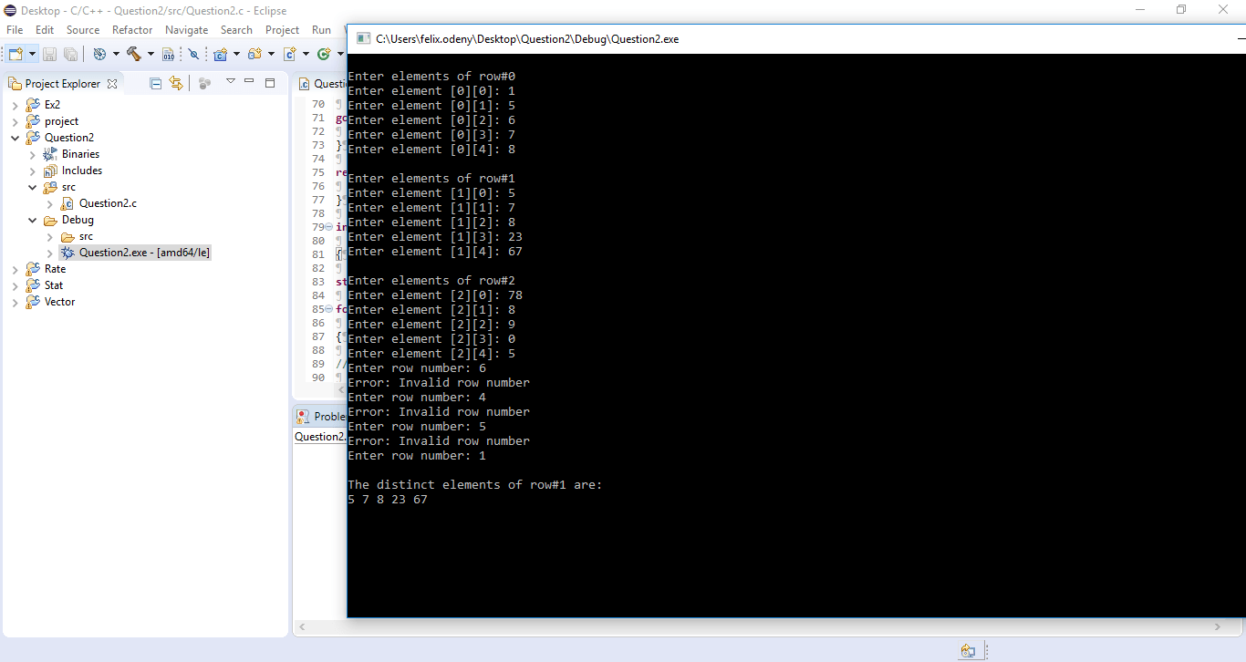 The main function then passes the returned row number n and the 2D-array to a function distinctRowElements that returns a ID-array which contains the distinct elements Of row n Of the 2D-array together with the number of distinct elements in that row. The main function finally displays the returned array of distinct elements.