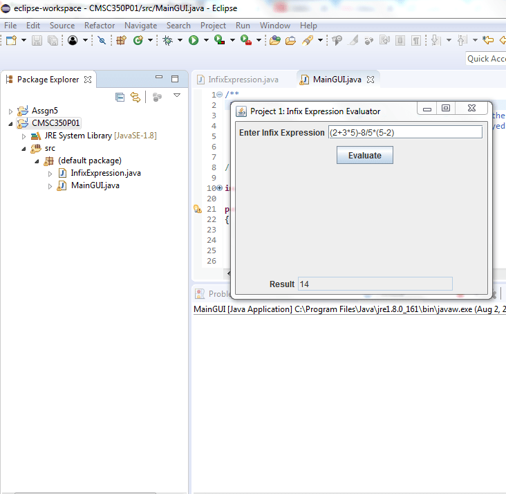 The first programming project involves writing a program that evaluates infix expressions of unsigned integers using two stacks. The program should consist of three classes. The main class should create a GUI that allows the user input an infix expression and displays the result. The GUI should look as follows: