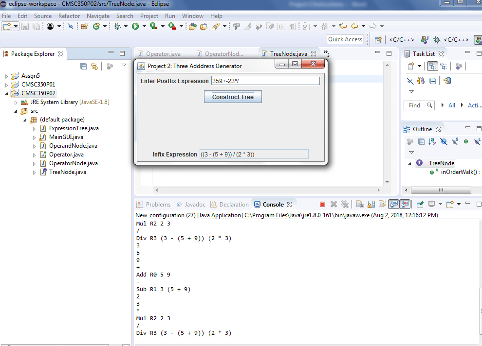 The second programming project involves writing a program that accepts an arithmetic expression of unsigned integers in postfix notation and builds the arithmetic expression tree that represents that expression. From that tree, the corresponding fully parenthesized infix expression should be displayed and a file should be generated that contains the three address format instructions. This topic is discussed in the week 4 reading in module 2, section II-B. The main class should create the GUI shown below: