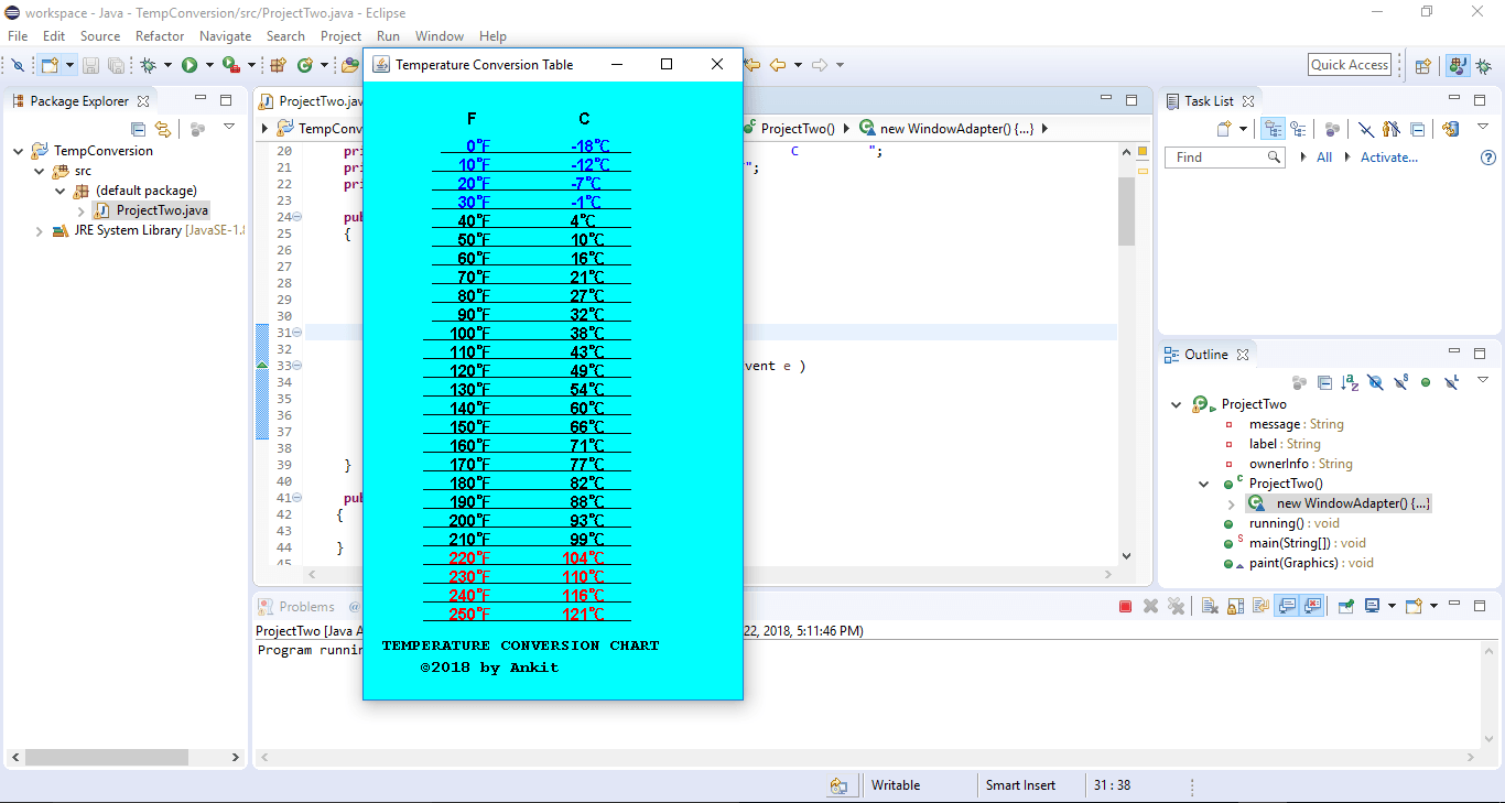Frame or a swing JFrame. The table should run from 0 degrees Fahrenheit to 250 degrees Fahrenheit, in steps of 10 degrees. Round the Celsius temperature values to the nearest integer.Display any temperatures below the freezing point of water (32o Fahrenheit) in blue and any temperatures above the boiling point of water (212o Fahrenheit) in red (the rest in black).