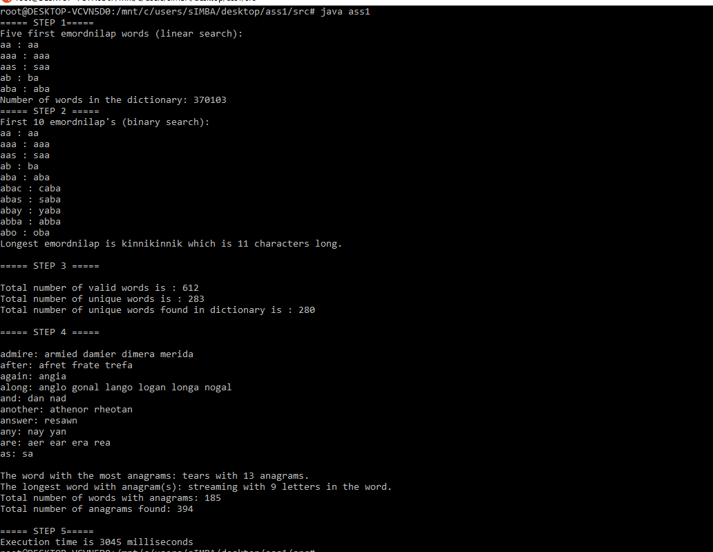 Before you commence Step-2, estimate how long it would take for your step-1 linear search to find all the emordnilap words in the dictionary? Now, replace the linear search with a binary search and determine the time to find ALL the emordnilap words in the dictionary. Write your estimate of the speedup factor in the report in Step-5. Print on the screen: the first 10 emordnilap words found (similar to step-1) and the longest emordnilap word found. (Note: if there is more than one emordnilap word with the longest length, print the first one only.) Implement other speed enhancements if you can think of any.