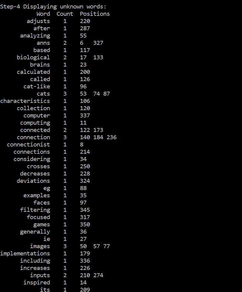 A “known” word is a word that is in the English dictionary which is defined by the words listed in the file named “dictionary.txt”. The word “Positions” are determined by all the places where each word occurs in the data file. For example, in the above screen output, the word “first” occurred twice, at the 20th and 110th word position in the test data file.