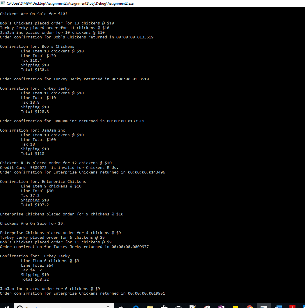 - OrderProcessing is a class or a method in a class on server side. Whenever an order needs to be processed, a new thread is instantiated from this class (or method) to process the order. It will check the validity of the credit card number. You can define your own credit card format, for example, the credit card number from the retailers must be a number registered to the ChickenFarm, or a number between two given numbers (e.g., between 5000 and 7000). Each OrderProcessing thread will calculate the total amount of charge, e.g., unitPrice*NoOfChickens + Tax + shippingHandling. It will send a confirmation to the retailer when an order is completed. The confirmation must be implemented using a callback method.
