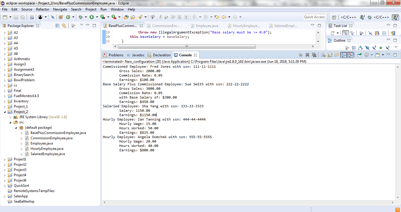 The SalariedEmployee will need the additional instance variable of salary, and the HourlyEmployee will need the additional instance variables of hourlyWage and hoursWorked. Add setters and getters for these classes as appropriate. These classes will also need the earnings method and an override for the toString() method. The SalariedEmployee class will need a setSalary method to set the current salary for the employee. The HourlyEmployee class will need set methods for the hourlyWage and hoursWorked variables also. Salary and hourlyWage should be checked to make sure they are greater than zero and hoursWorked should be checked to ensure that it is between 1 and 168 (the number of hours in a week).