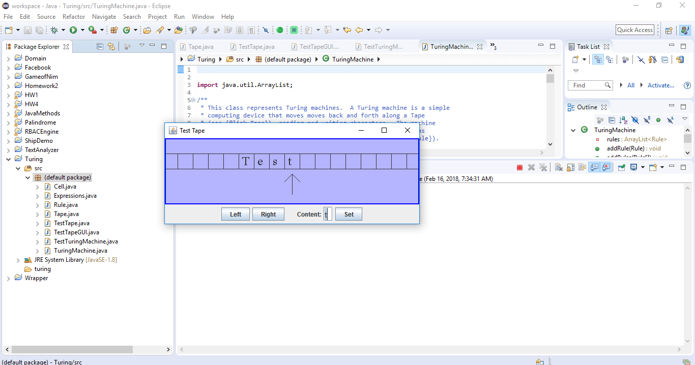 To test your Tape class, you can should run the programs that are defined by the files TestTape.java, TestTapeGUI.java, and TestTuringMachine.java. The first two programs just do things with a tape, to test whether it is functioning properly. TestTuringMachine actually creates and runs several Turing machines, using your Tape class to represent the machines’ tapes.