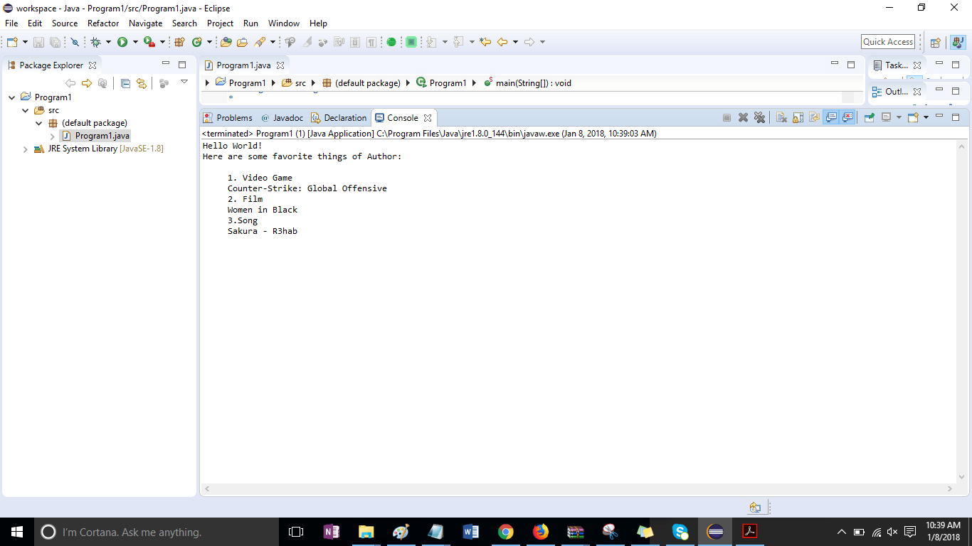 Write a program titled “YourLastName_Program1” that prints out “Hello world”, your name, the name of your favorite video game, the name of your favorite film, and the name of your favorite song and the artist(s) who play it.
