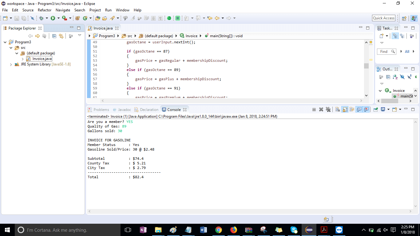 After acquiring the input, the program should apply any discounts due to membership ($0.10 per gallon if they’re a member), compute the subtotal (quantity times price, remember the membership discount to price if applicable), county tax (7% of the subtotal), city tax (3.75% of the subtotal) and total, and print an invoice.