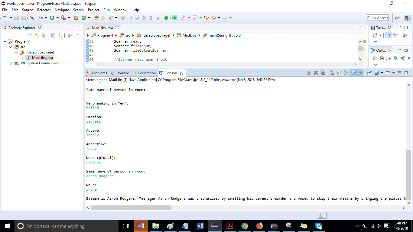 The program should do the following: read the file and determine how many times to prompt the user for input, prompt the user for a word using the description from the file, write the user’s answer to a separate text file, and then write the result of the Mad Lib to the console using the story from the input file and the user’s answers from the separate text file.