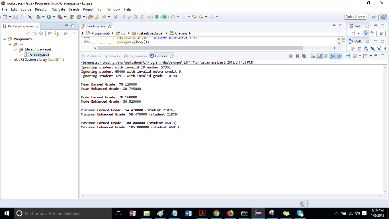 The program will read in lines as input from the text file, accumulate summary data about the students while ignoring any line with any invalid data. The summary data will include information on the mean, mode, minimum, and maximum of the grades (both the earned grades and the enhanced grades), including the student ID of the students with the highest and lowest grades (both earned and enhanced). *NOTE: Do NOT use arrays, or other topics we have not yet taught. Use enough variables to save all the information for each student.