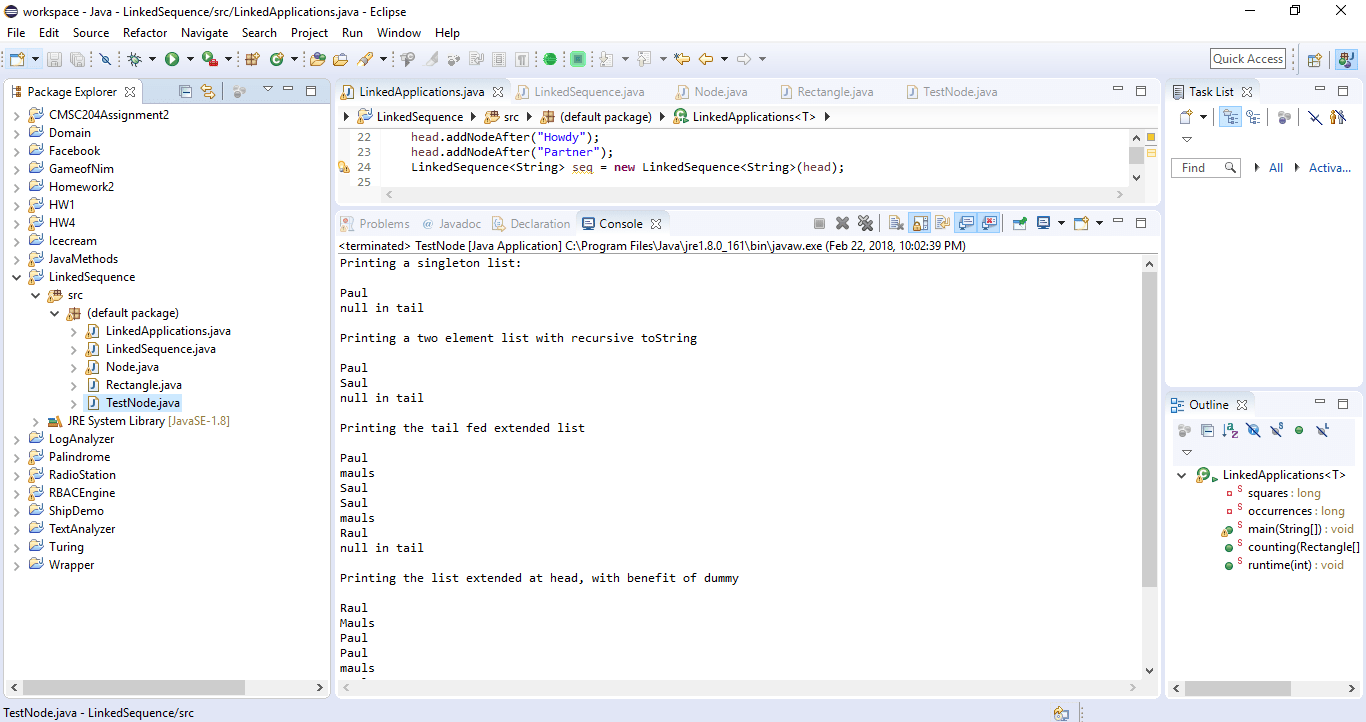 also be added to project, since in one of the applications the stored data are Rectangle objects. The other application utilizes the String class from the Java library. For testing purposes two more classes will be needed: TestNode to test the Node class methods, and LinkedApplications to use the data structure.